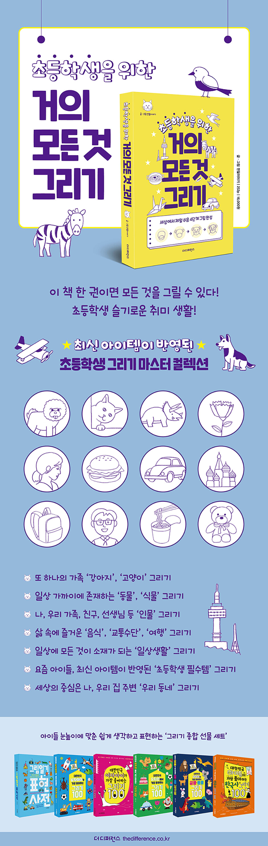 『거의 모든 것 그리기』는 강아지부터 고양이, 동물, 식물, 인물, 음식, 교통수단, 여행, 일상생활, 초등학생 필수템,