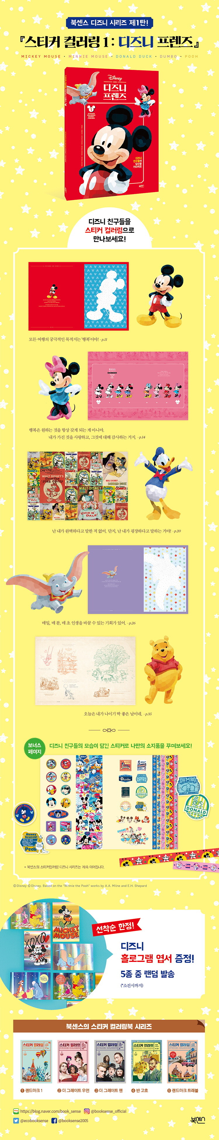 《스티커 컬러링1: 디즈니 프렌즈》는 미키 마우스, 미니 마우스, 도널드 덕, 아기 코끼리 덤보, 곰돌이 푸의 스티커 컬러링과 함께 백여 컷의 아름다운 오리지널 이미지들이 한 권에 담긴 선물상자 같은 책이다.