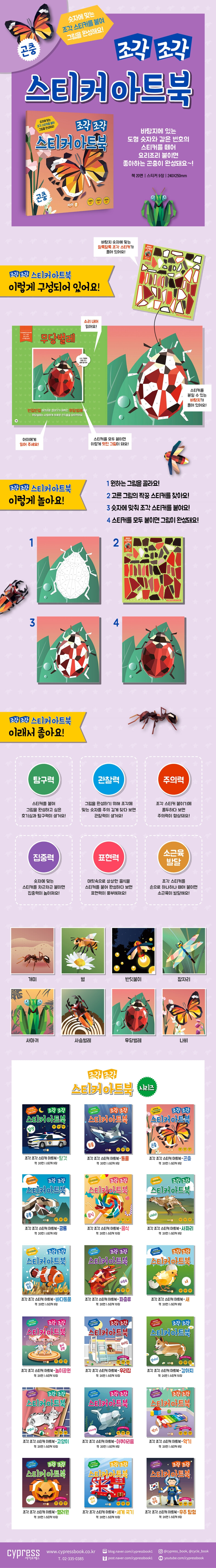 아이들이 좋아하는 다양한 곤충들로 구성되어 있어요. [조각 조각 스티커 아트북]은 별다른 도구 없이 손으로 스티커를