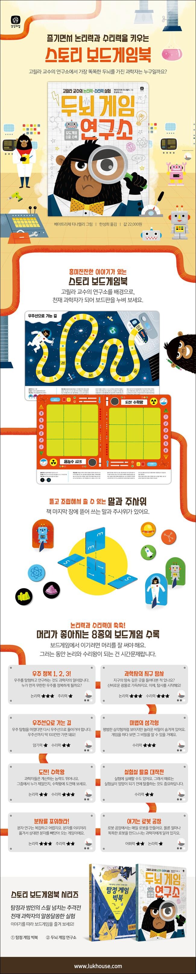 로봇 공장 등 이곳저곳을 누비며 보드게임을 합니다. 8개의 보드게임에서 가장 많이 승리한 사람이 연구소에서 최고로 똑똑한 과학자가 되는 것이지요.게임의 승부만큼 궁금한 것이 이야기의 결말입니다. 고릴라 교수 연구소의 실험은 어떻게 될까요? 누가 연구소에서 제일 똑똑한 과학자가 될까요? 이 질문에 대한 대답은 플레이어에게 달려 있습니다. 게임을 할 때마다 결말이 바뀌기도 하겠지요.물론 책에 있는 순서대로 똑같이 모든 게임을 즐길 필요는 없습니다. 더 재미있다고 느끼는 게임이 있다면 그것만 여러 번 할 수도 있고, 단 하나, 혹은 한 번의 게임으로 승부를 가릴 수도 있습니다. 자신만의 방법으로 게임을 즐겨 보세요. 『두뇌 게임 연구소』는 플레이어가 함께 이야기를 꾸미는 스토리 보드게임북이니까요.