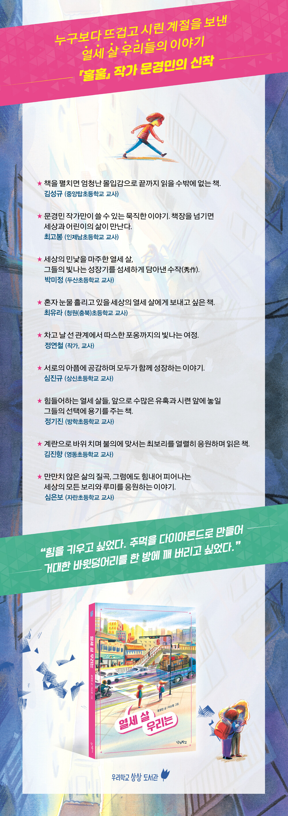 「우투리 하나린」 등 어린 십 대들의 내면을 선명하고 섬세하게 그려온 문경민 작가가 열세 살의 시간에만 가능한 이야기, 책을 펼치면 단숨에 엔딩까지 읽게 되는 몰입감 넘치는 이야기로 돌아왔다.